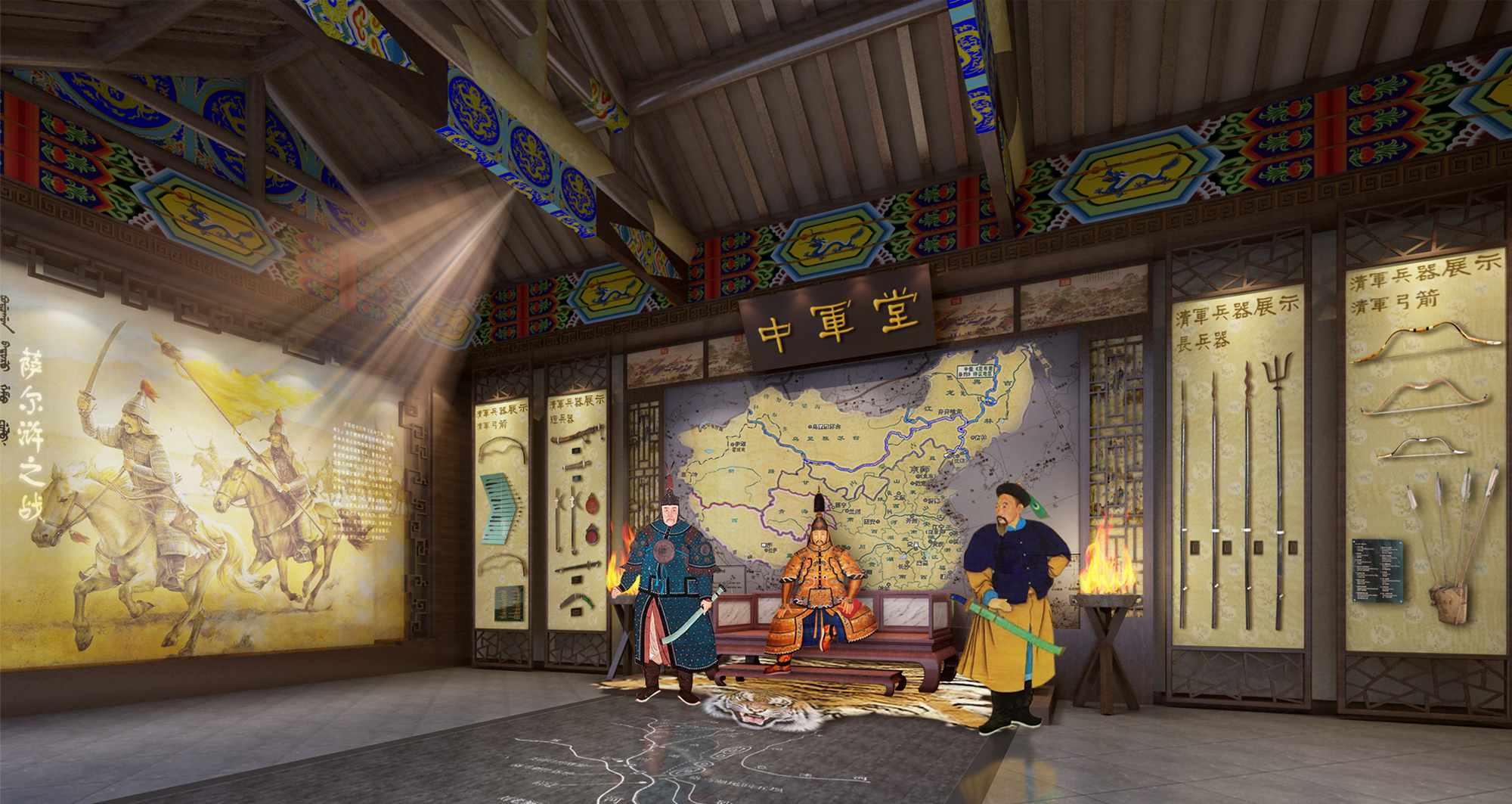 方案設(shè)計(jì)摒棄原來(lái)單一以“展廳”形式為主的流陳,增加了多處場(chǎng)景還原,真實(shí)再現(xiàn)當(dāng)年八旗子弟生活工作的場(chǎng)面。此案在設(shè)計(jì)上巧妙的把滿族文化融入到生活場(chǎng)景中,如“滿族萬(wàn)字坑”“清代閨房”“神桿”等,再輔以古色古香的墻面石刻與展柜,在有限的空間內(nèi)盡可能完整全面的呈現(xiàn)八旗文化。