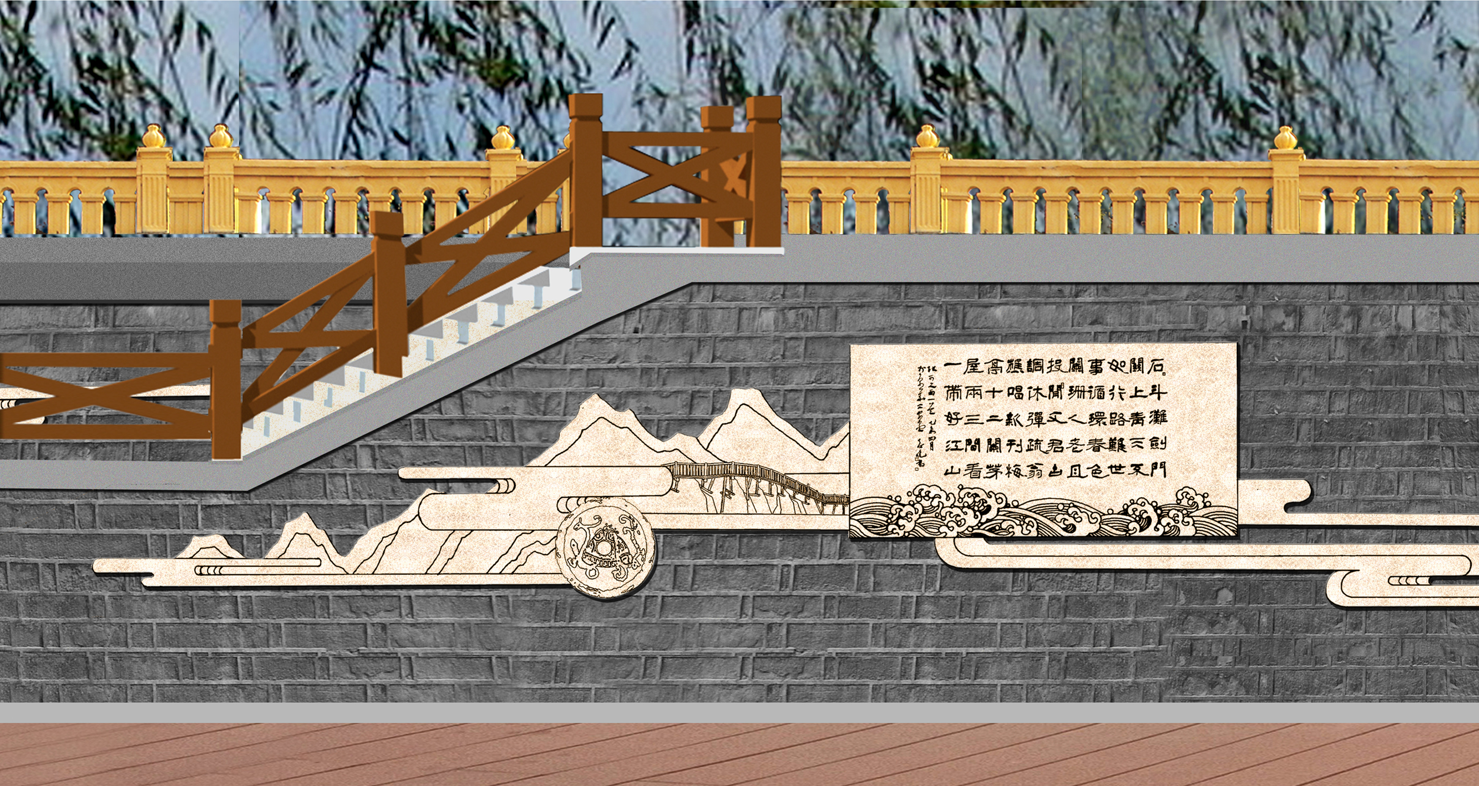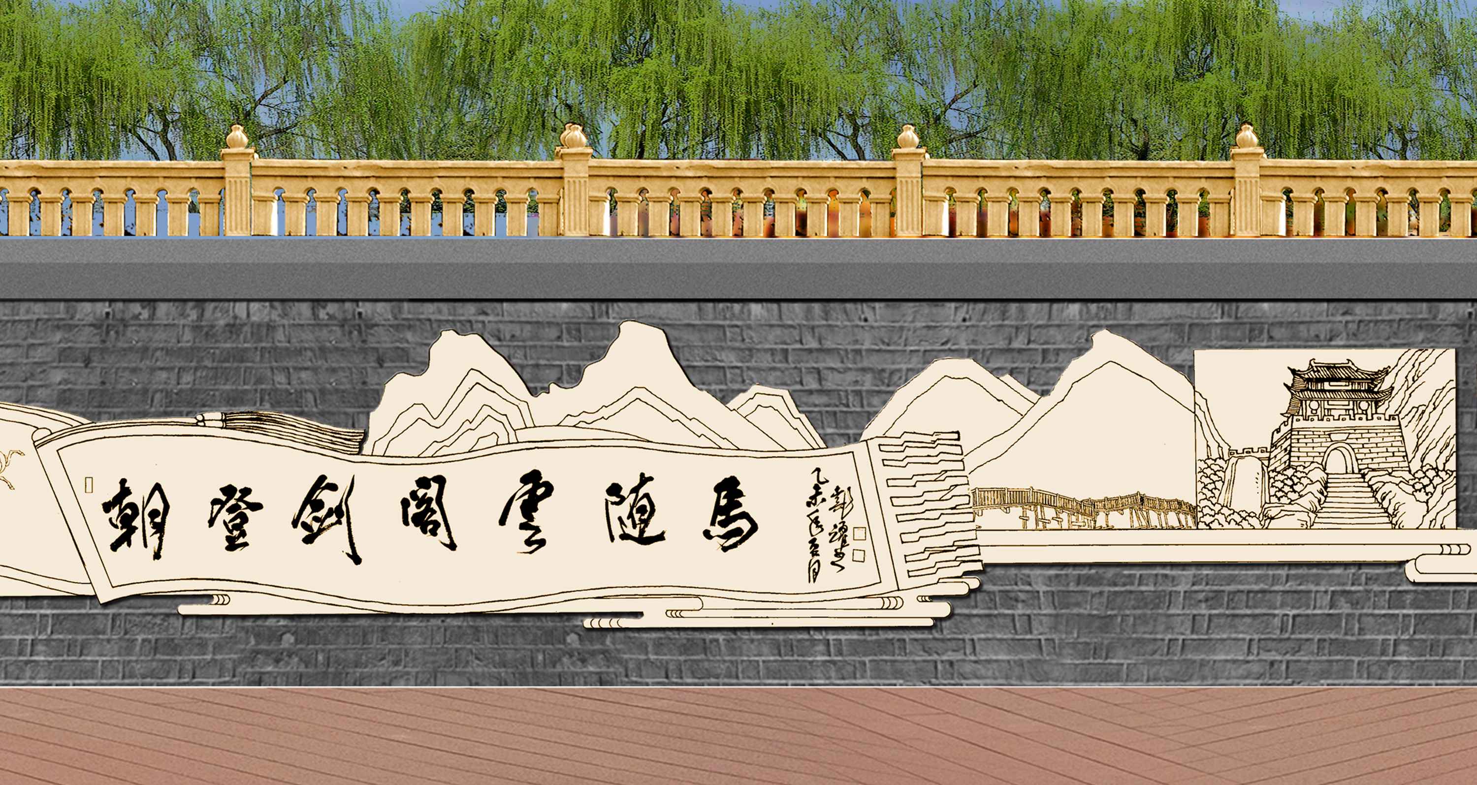 蜀道詩歌大道位于廣元市區嘉陵江畔,背靠鳳凰山景區,與皇澤寺景區隔江相望。整個蜀道詩歌大道沿著廣元市區的嘉陵江,從摩爾天城到將軍橋,途經利州西路、打鐵街、大西路、望江樓、小西路、皇澤大橋等,全長約3 公里。通過對蜀道文化的深刻解讀,以廣元“生態立市、文旅興市”的發展戰略為理念,充分結合大唐利州女皇城、國家歷史文化名城創建、嘉陵江生態文化休閑軸營造文化休閑長廊。設計上以石刻為核心表現手法,同時融合蜀道山川、壁畫、卷軸、碑林、綠植等設計元素,營造出整體統一、厚重,局部多姿多彩的蜀道詩歌大道。