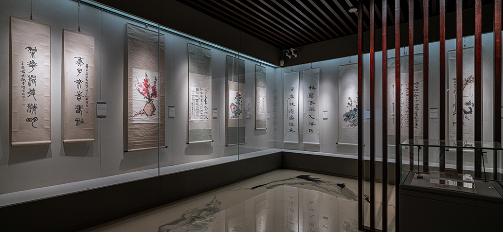 君匋藝術院展廳陳列的主要內容是書畫印章。二層展廳設有展櫥及展柜,用于陳列錢君匋先生的書畫印章,還設有錢君匋藝術生涯陳列室。底層展廳用大展板的形式將六開間的展覽大廳分隔成兩間用于陳列巨幅書畫,兩個展廳均鋪設復合地板,裝修新穎,并裝置了微波動態防盜報警系統,以保證日常需求。
