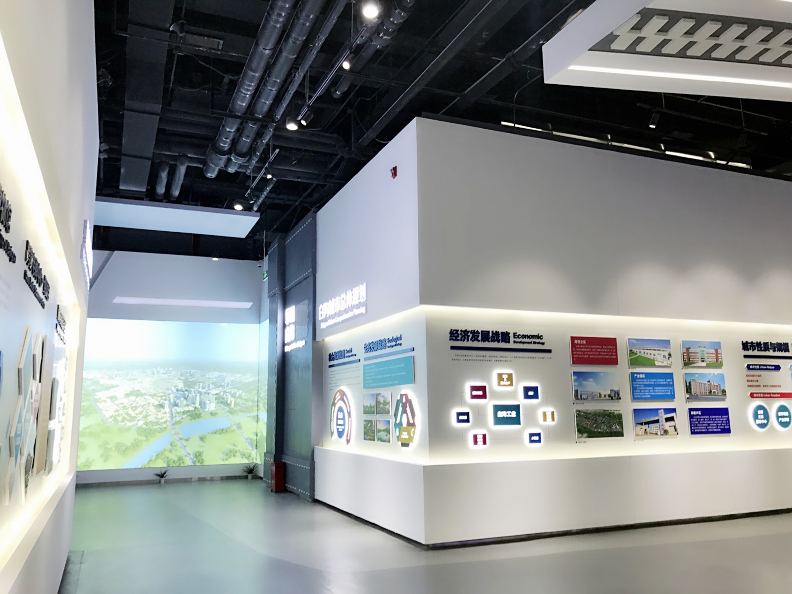總規沙盤是整個展館的重點、亮點展項,深化設計中為給業主節省空間,將這一區域分成兩層,上層做總規沙盤,下層即沙盤下方設計成辦公、休息、機房、監控室等公用空間。此時已經到了布展施工的最后階段,工期緊、任務重,項目部制定了詳細縝密的穿插施工計劃,沙盤頂部、中間層、地層同時施工,加班加點保證了業主要求的開館時間。