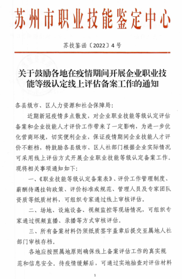 3月31日,蘇州市職業技能鑒定中心發布了《關于鼓勵各地在疫情期間開展企業職業技能等級認定線上評估備案工作的通知》
