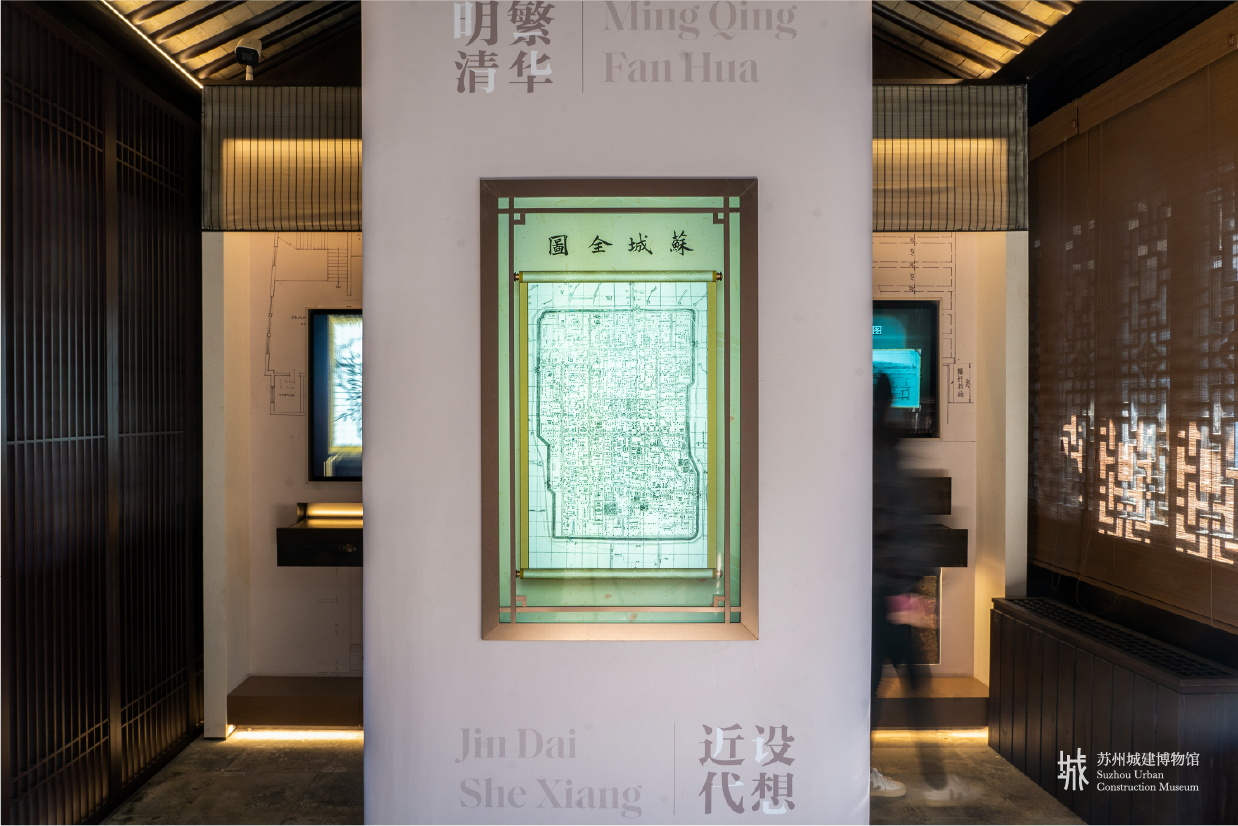 金螳螂文化項目團隊以蘇州之窗為核心元素構建了穿越古今的時光通道,貫穿起蘇州城建博物館城紀千載、現代蘇城、城市生長、城市客廳、百館之城等主要展廳。