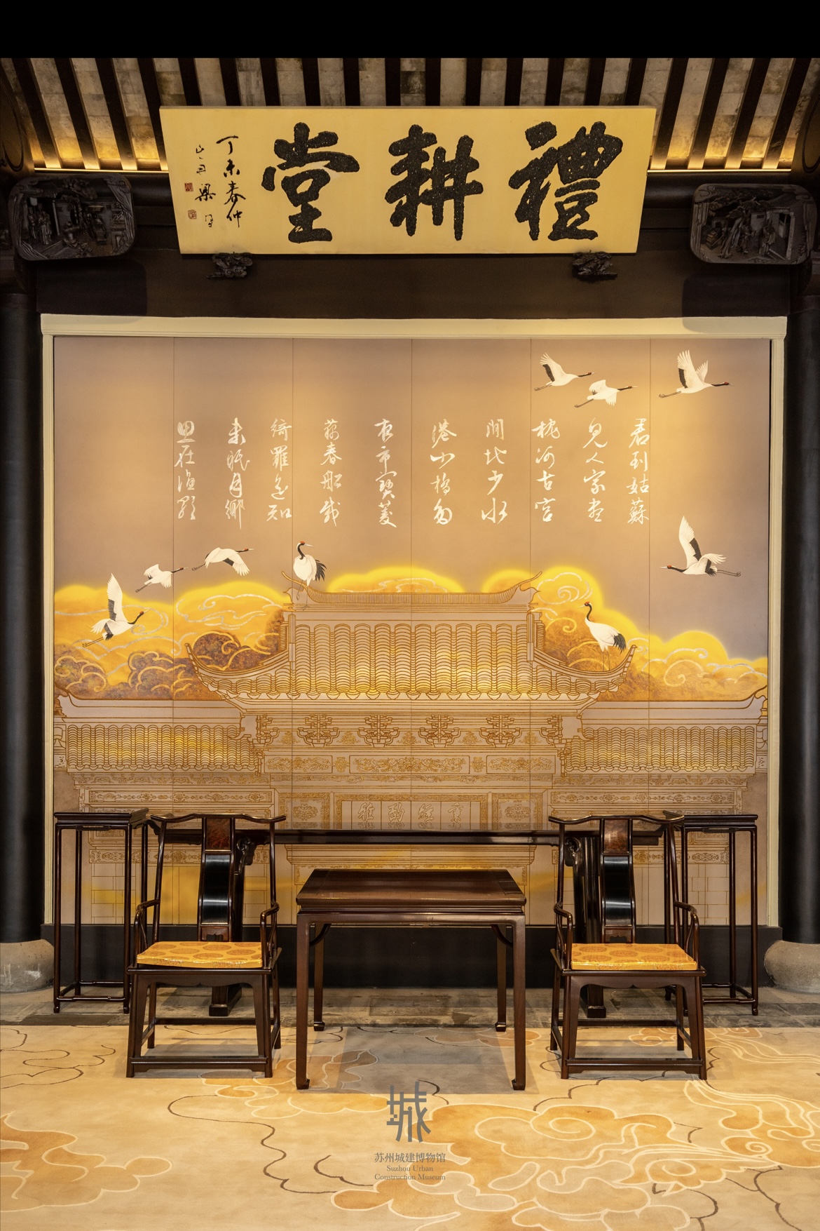 中堂設計以潘宅磚雕門頭為原型,借用唐代杜荀詩句鶴送人游吳,集字唐寅書法,采用漆畫工藝制作。整個大廳結構規整,氣勢恢宏,為清乾隆時期具有代表性的建筑作品。一磚一瓦,一草一木,觸手可及三百年的滄桑變換。