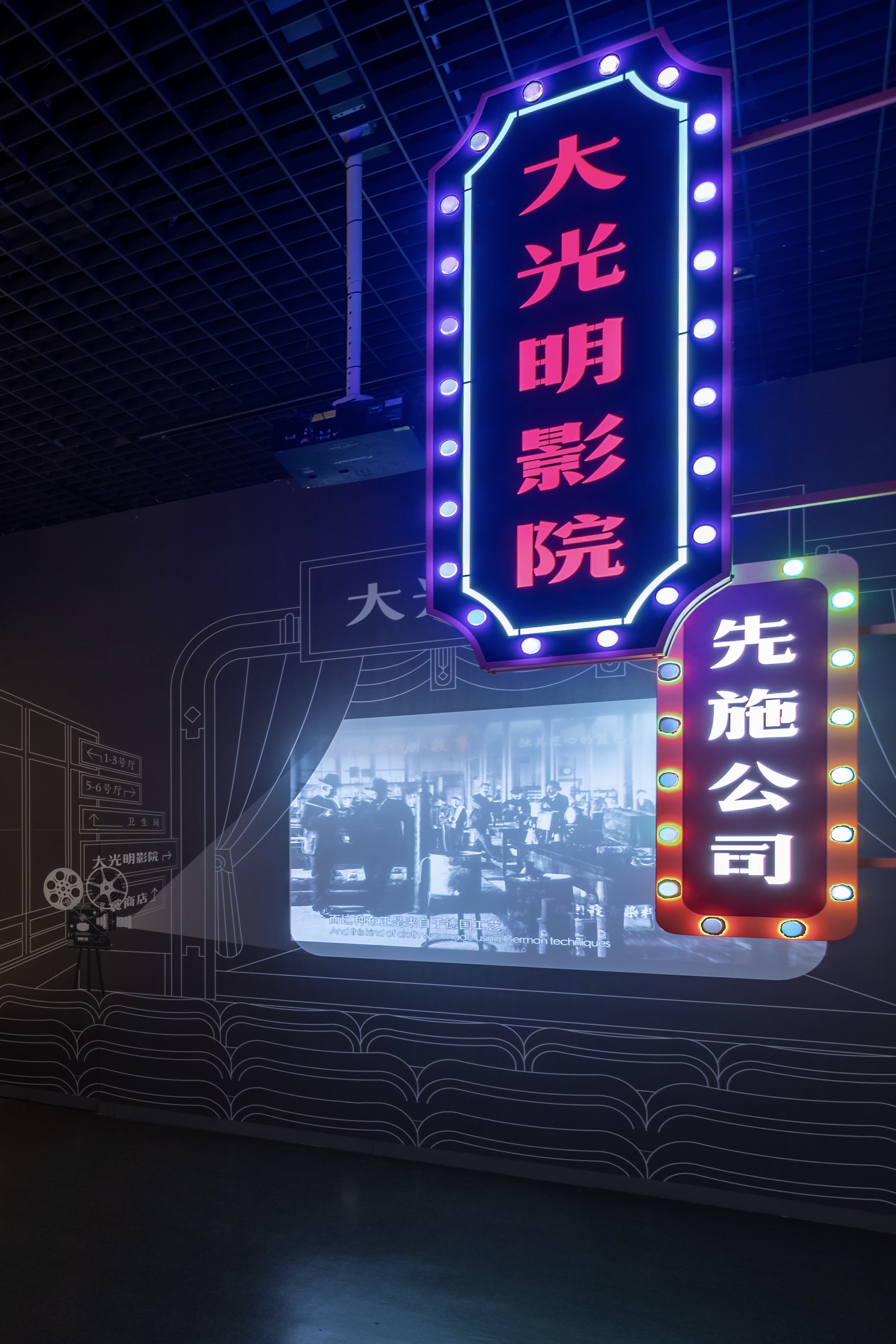 展覽中,我們設計了去上海、回徽州、到法國等多個集聲影于一體的打卡點,運用劇場的手法來表達人物故事。