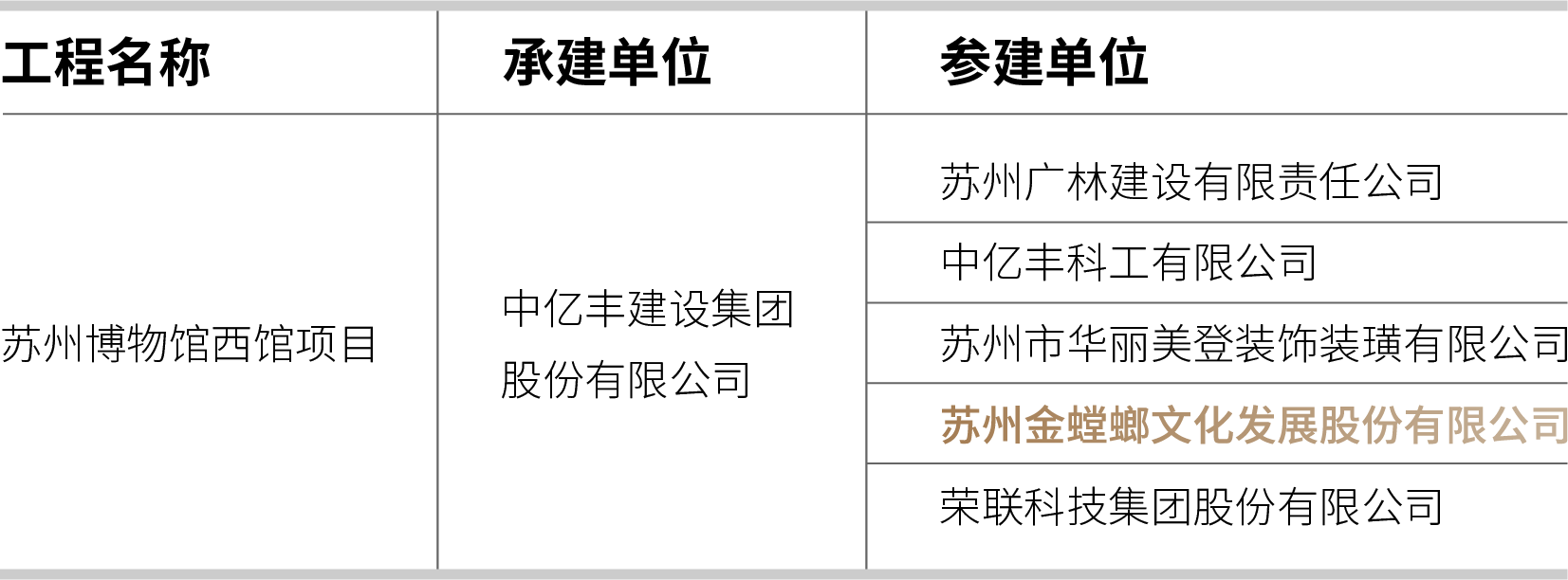 近日 中國建筑業(yè)協(xié)會公示 2022-2023年度第二批 中國建設(shè)工程魯班獎(國家優(yōu)質(zhì)工程) 入選名單 金螳螂文化匠心打造的項目 蘇州博物館西館 榜上有名 “魯班獎”是中國建筑行業(yè) 工程質(zhì)量最高榮譽獎項 是建筑行業(yè)領(lǐng)域的“奧斯卡” 代表了我國當前工程建設(shè)質(zhì)量的最高水平 金螳螂文化再次獲得 “魯班獎” 是項目團隊高標準嚴要求的實踐注解 也是企業(yè)匠心質(zhì)造的最佳映證 蘇州博物館西館位于江蘇省蘇州市高新區(qū)獅子山下,展陳面積13391平方米。 作為蘇州博物館的重要組成部分,蘇州博物館本館與西館,一傳統(tǒng),一當代;一江南,一國際;一重觀展,一重體驗。兩館錯位發(fā)展,彰顯著蘇州博物館“代表江南文化、創(chuàng)新發(fā)展和引領(lǐng)行業(yè)發(fā)展的一流的世界級博物館”的發(fā)展理念。 “純粹江南 技憶蘇州——蘇州博物館西館基本陳列”展覽包括“純粹江南”與“技憶蘇州”兩個部分,圍繞如何解讀作為江南核心的蘇州,以一萬年蘇州歷史和一千年蘇作工藝為主題,講述蘇州故事,展示蘇作匠心。 由金螳螂文化設(shè)計打造的“純粹江南 · 蘇州歷史陳列”是蘇州地區(qū)首個通史陳列,用1200余件/套文物,講述蘇州萬年文明史、兩千五百年城市史,溯源蘇州文脈傳承和地域文化發(fā)展。 以此次榮獲“魯班獎”為契機 金螳螂文化將 不斷追求卓越品質(zhì) 提煉“真金” 助力文化展示行業(yè)的高質(zhì)量發(fā)展 精益求精,再創(chuàng)佳績 向光而行,共赴熱愛