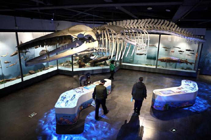 更新后的自然廳一樓以江海生物為主,展示了大須鯨、小鰛鯨、中華鱘、江豚等黃海區(qū)域及長(zhǎng)江流域的特色物種;二樓區(qū)域展示了南通地域獨(dú)特的山林動(dòng)物,如梅花鹿、黃麂、貉等,以及南通沿海灘涂珍稀遷徙鳥類,如白琵鷺、反嘴鷸、白腰杓鷸等。本次自然廳共計(jì)展出標(biāo)本110余種。