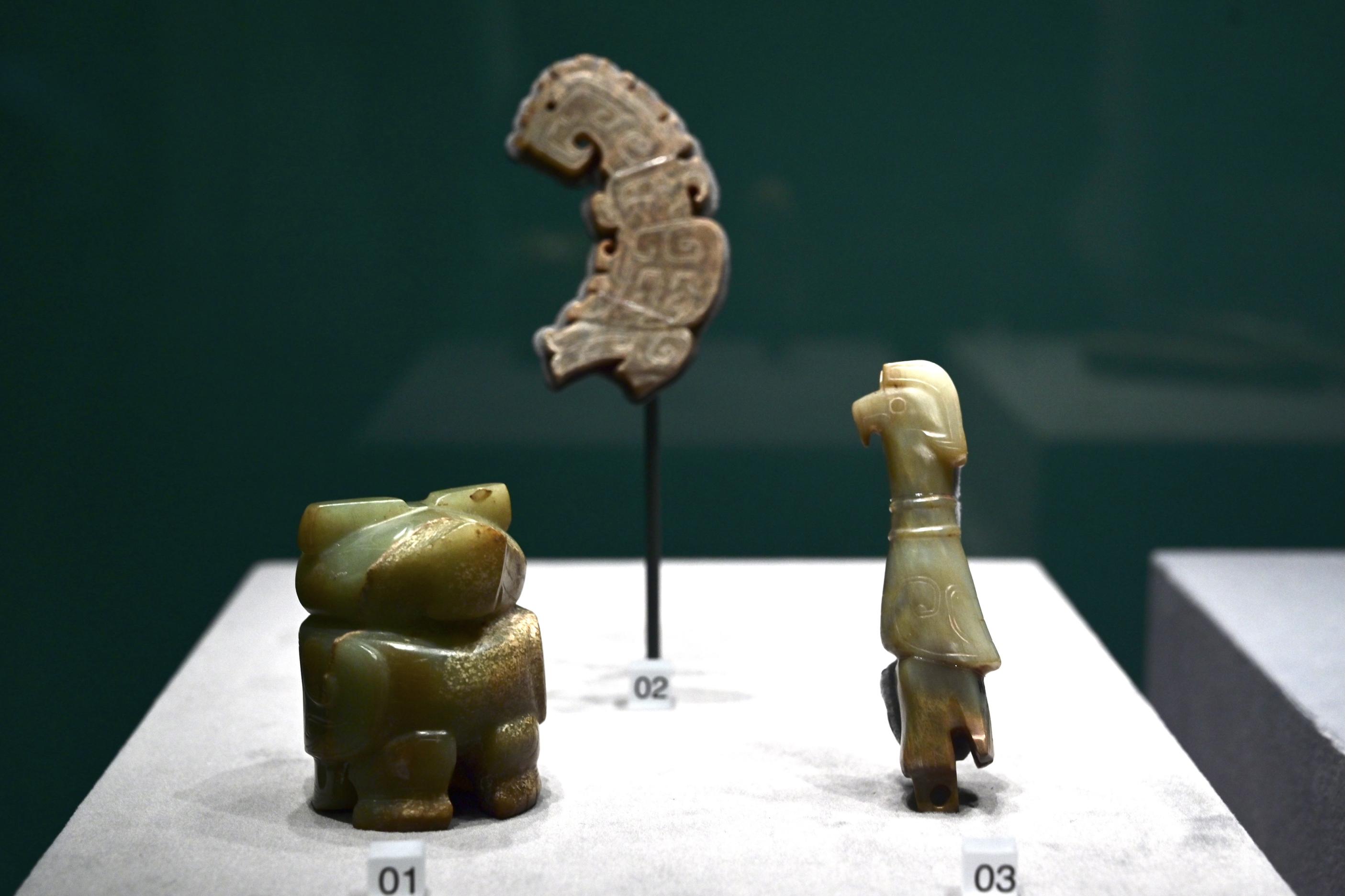 ▲ 河南安陽殷墟婦好墓出土玉鸮(左一)等